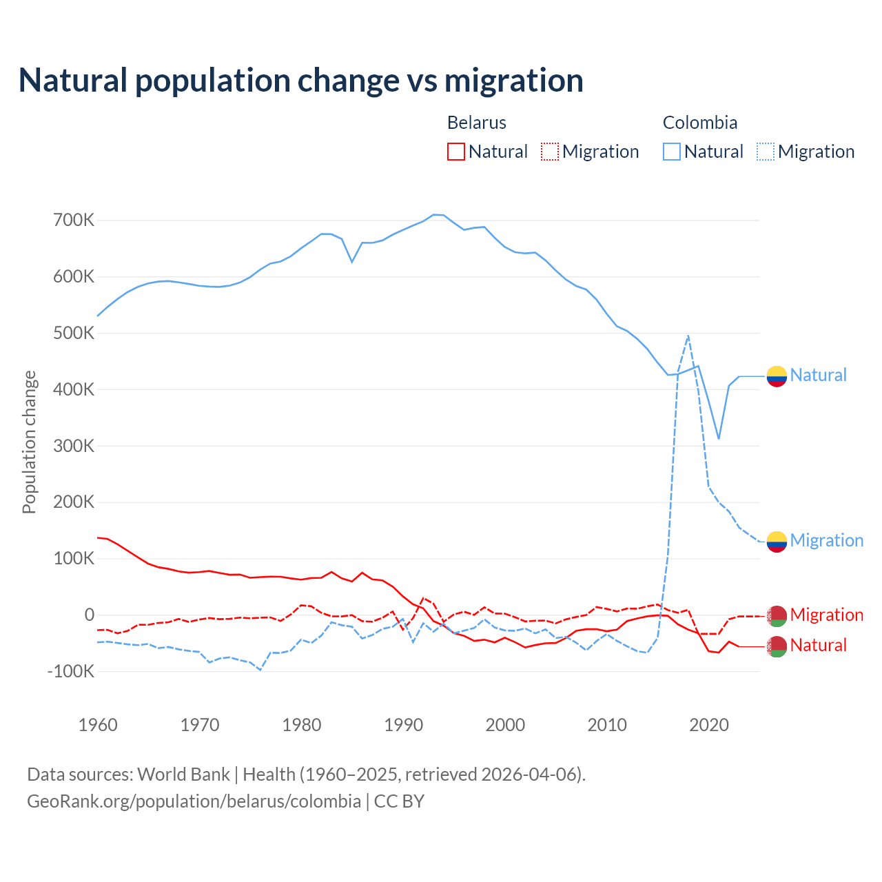 Over the last 10 years, 84.2% of the population change in Belarus is from natural causes (a loss of 318,682 people) and 15.8% is from migration (a loss of 59,605 people). In Colombia 66.6% is from natural causes (a gain of 4,162,856 people) and 33.4% is from migration (a gain of 2,083,051 people).