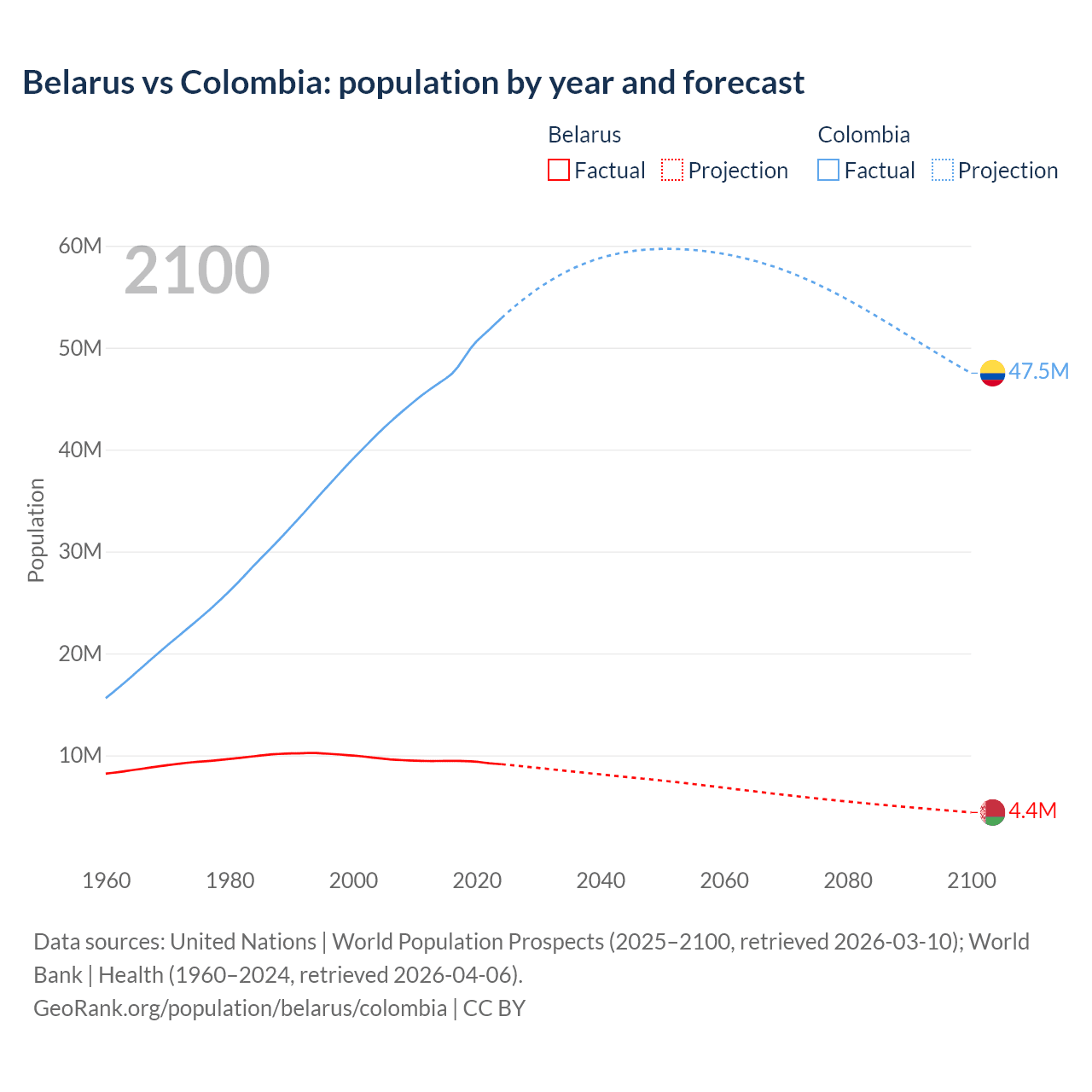 - Since 2006, the population of Belarus has decreased from 9.6M people to 9.01M (6.15% decline), while Colombia has grown from 42.7M to 54.1M (26.7% growth).