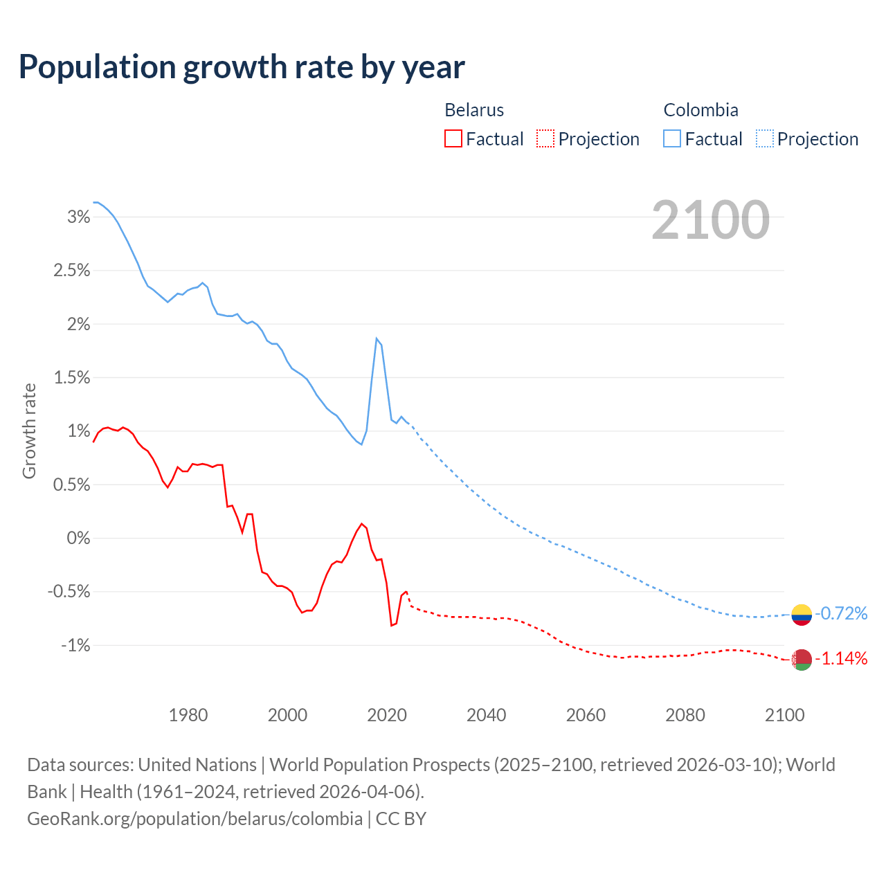 - For the last 10 years, Belarus has had an average growth rate of -0.3% per year vs +1.25% in Colombia.