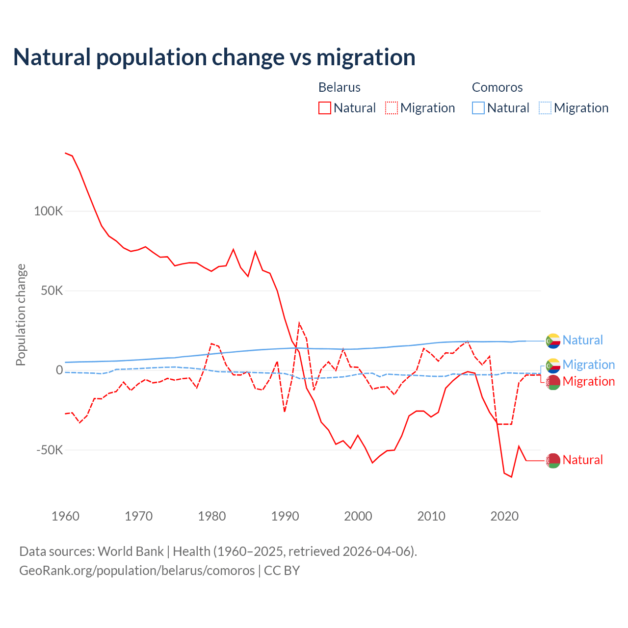 Over the last 10 years, 84.2% of the population change in Belarus is from natural causes (a loss of 318,682 people) and 15.8% is from migration (a loss of 59,605 people). In Comoros 87.9% is from natural causes (a gain of 179,319 people) and 12.1% is from migration (a loss of 24,709 people).