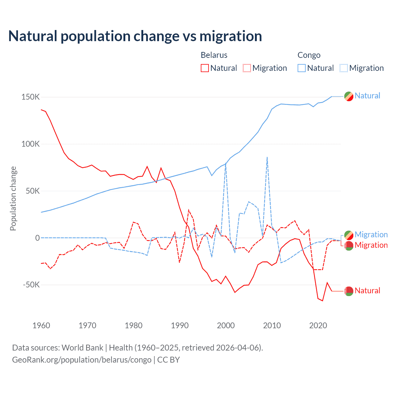 Over the last 10 years, 84.2% of the population change in Belarus is from natural causes (a loss of 318,682 people) and 15.8% is from migration (a loss of 59,605 people). In the Congo 94% is from natural causes (a gain of 1,434,056 people) and 6.04% is from migration (a loss of 92,251 people).
