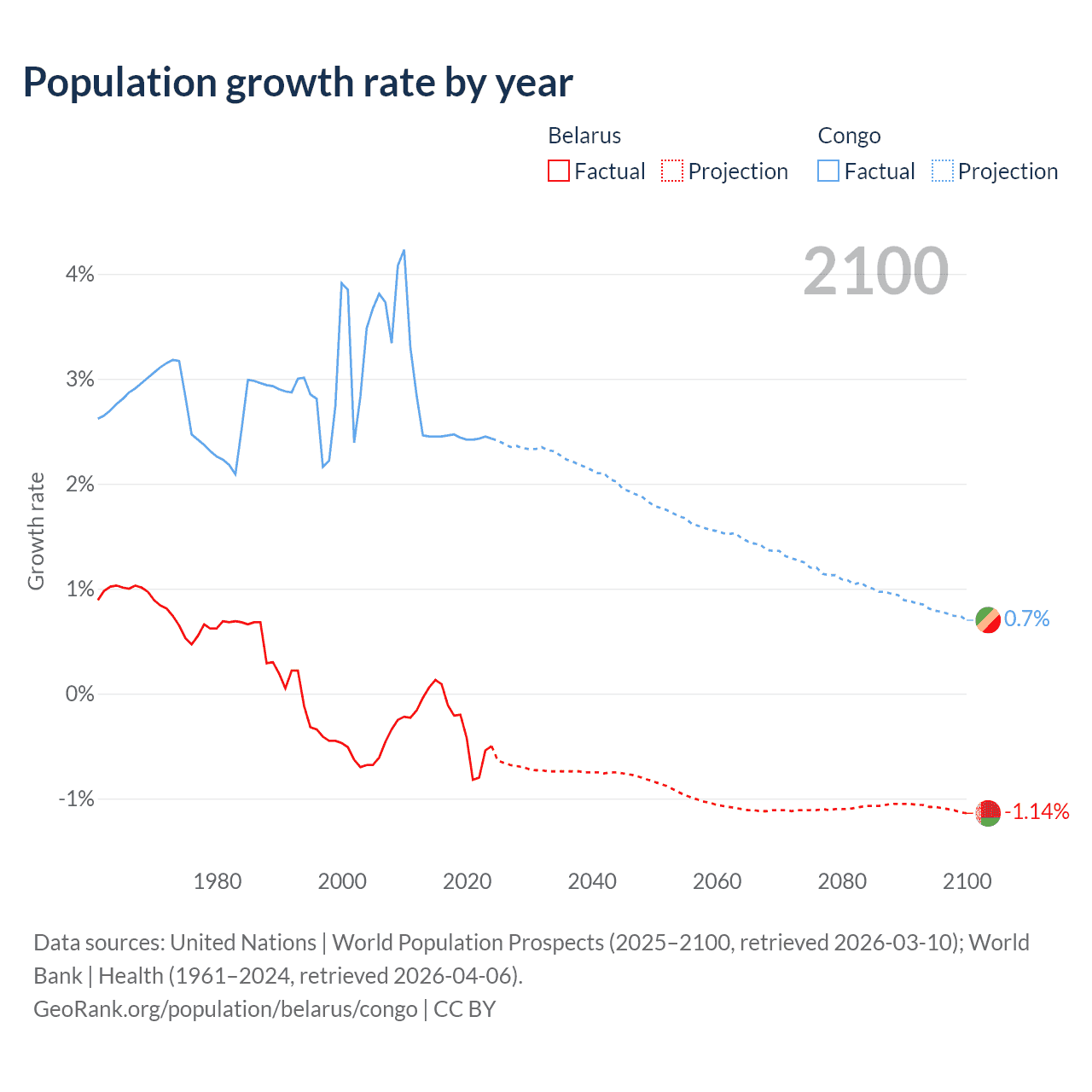 - For the last 10 years, Belarus has had an average growth rate of -0.3% per year vs +2.44% in the Congo.