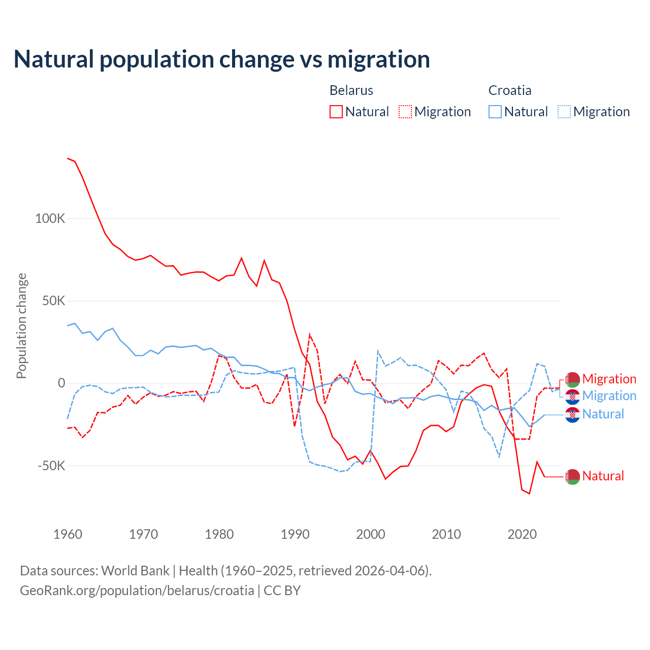 Over the last 10 years, 84.2% of the population change in Belarus is from natural causes (a loss of 318,682 people) and 15.8% is from migration (a loss of 59,605 people). In Croatia 54.8% is from natural causes (a loss of 177,803 people) and 45.2% is from migration (a loss of 146,770 people).