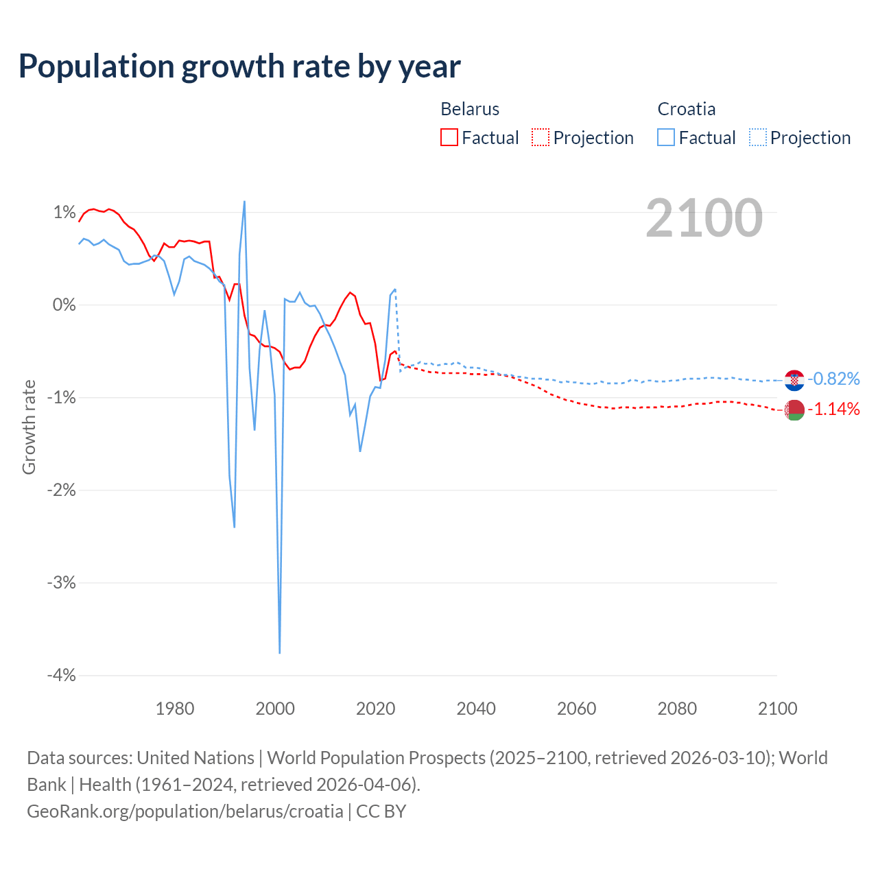 - For the last 10 years, Belarus has had an average growth rate of -0.3% per year vs -0.82% in Croatia.