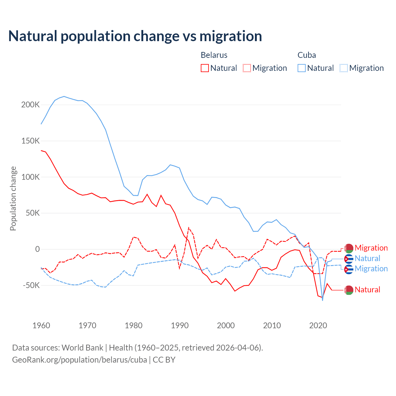 Over the last 10 years, 84.2% of the population change in Belarus is from natural causes (a loss of 318,682 people) and 15.8% is from migration (a loss of 59,605 people). In Cuba 21.9% is from natural causes (a loss of 64,179 people) and 78.1% is from migration (a loss of 229,508 people).
