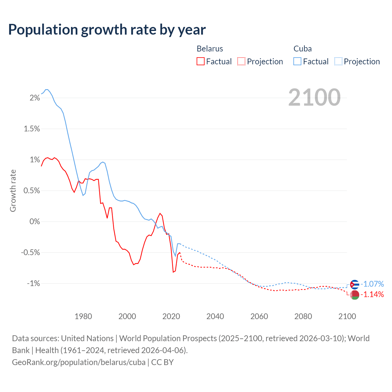 - For the last 10 years, Belarus has had an average growth rate of -0.3% per year vs -0.26% in Cuba.