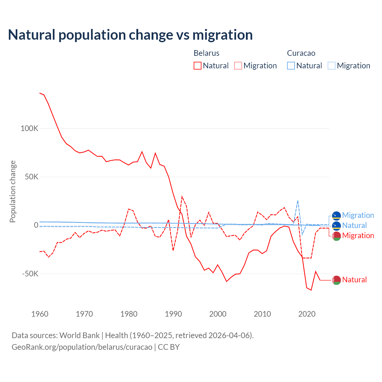 Over the last 10 years, 84.2% of the population change in Belarus is from natural causes (a loss of 318,682 people) and 15.8% is from migration (a loss of 59,605 people). In Curacao 3.72% is from natural causes (a gain of 834 people) and 96.3% is from migration (a gain of 21,615 people).