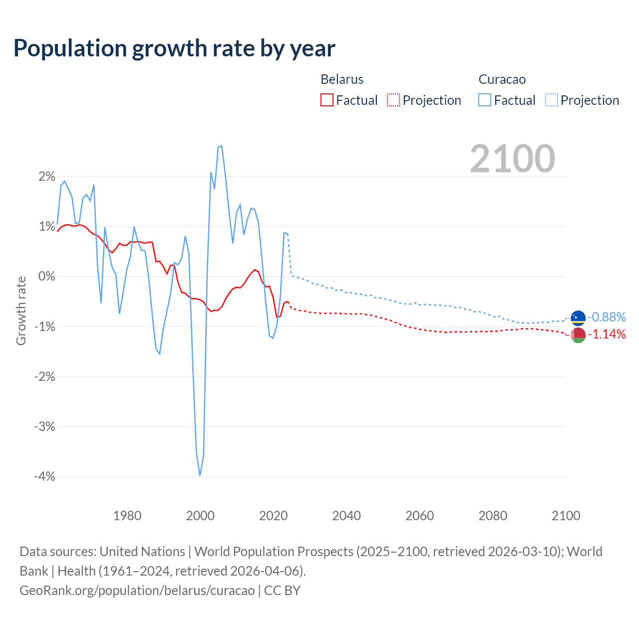 - For the last 10 years, Belarus has had an average growth rate of -0.3% per year vs +0.13% in Curacao.