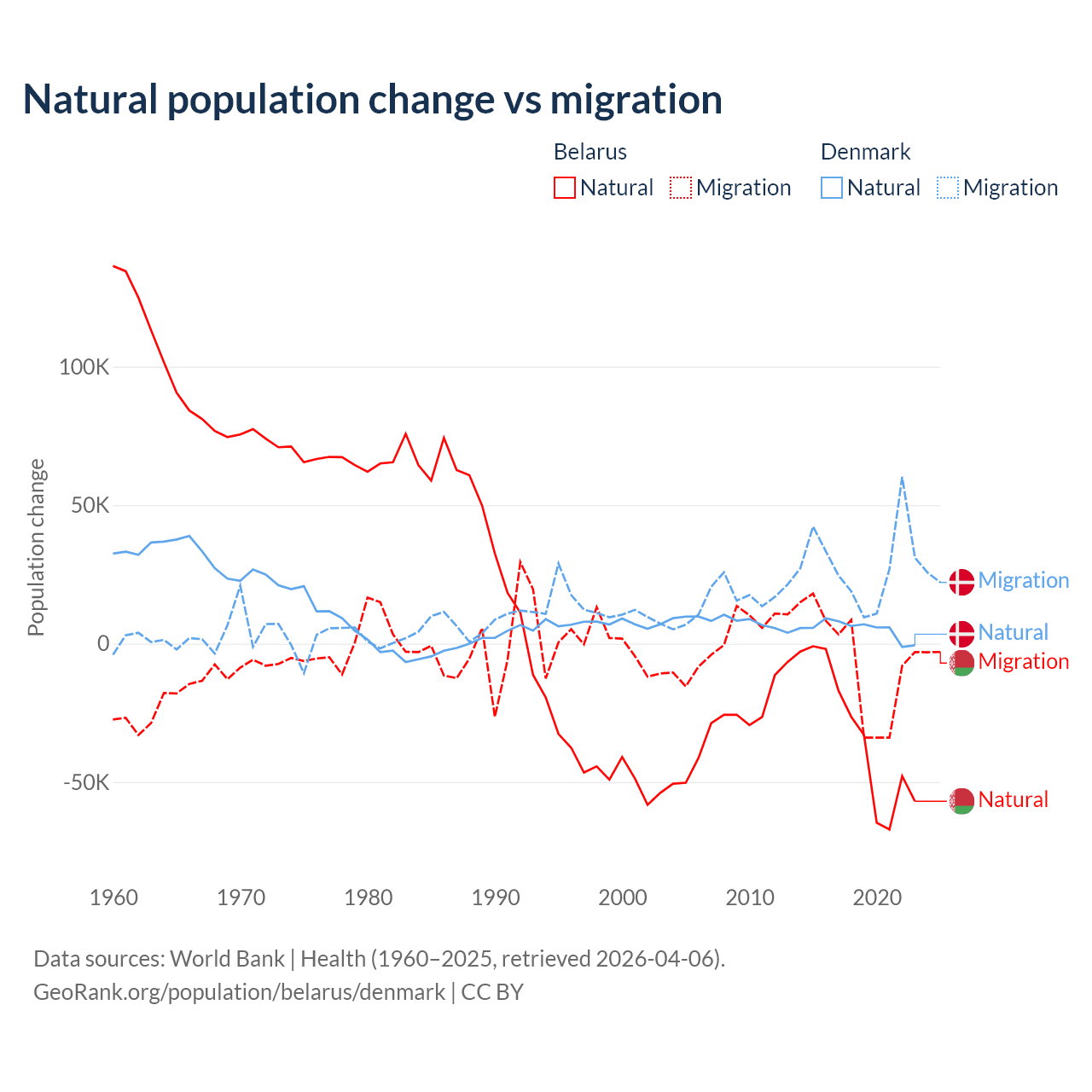 Over the last 10 years, 84.2% of the population change in Belarus is from natural causes (a loss of 318,682 people) and 15.8% is from migration (a loss of 59,605 people). In Denmark 15.4% is from natural causes (a gain of 51,826 people) and 84.6% is from migration (a gain of 284,848 people).