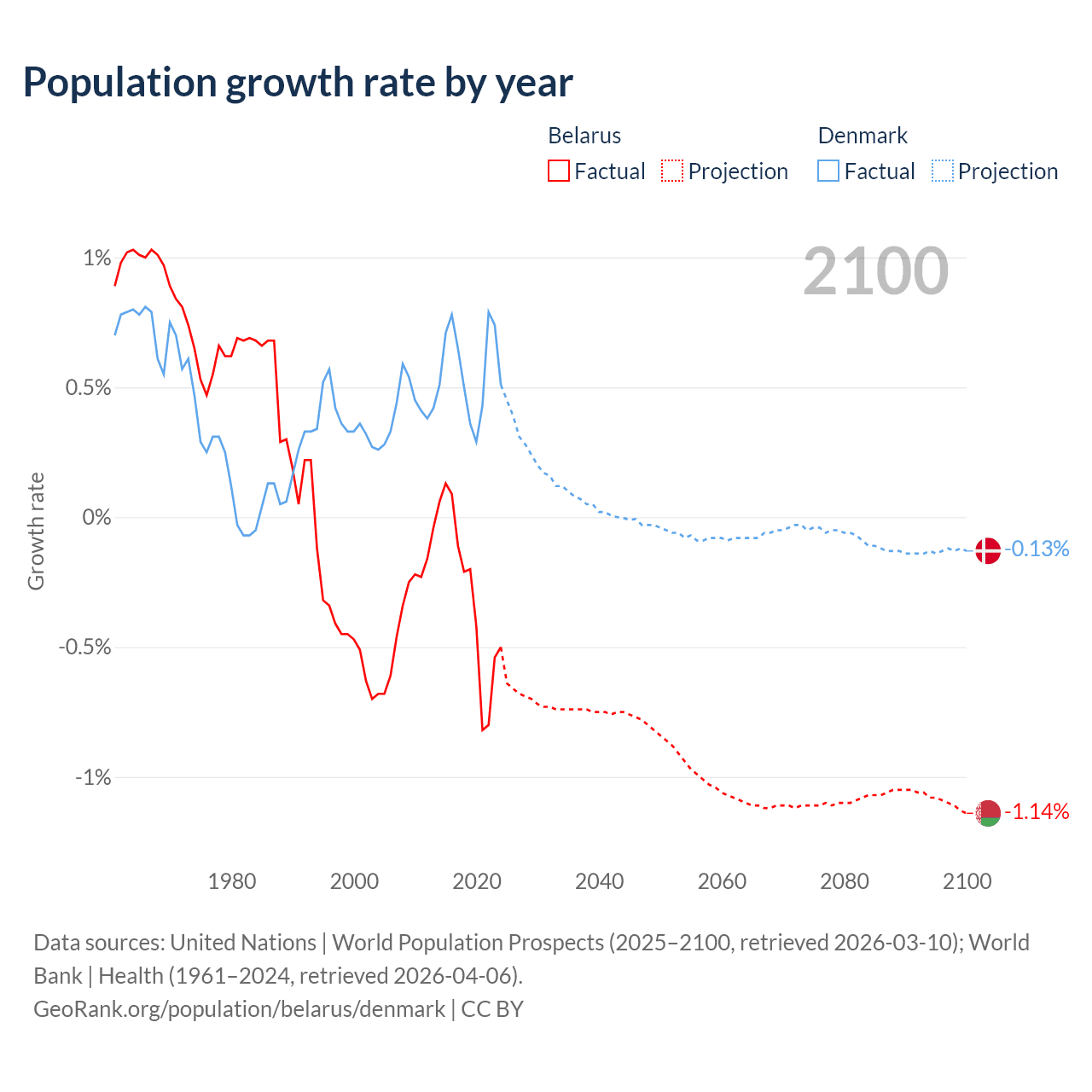 - For the last 10 years, Belarus has had an average growth rate of -0.3% per year vs +0.57% in Denmark.