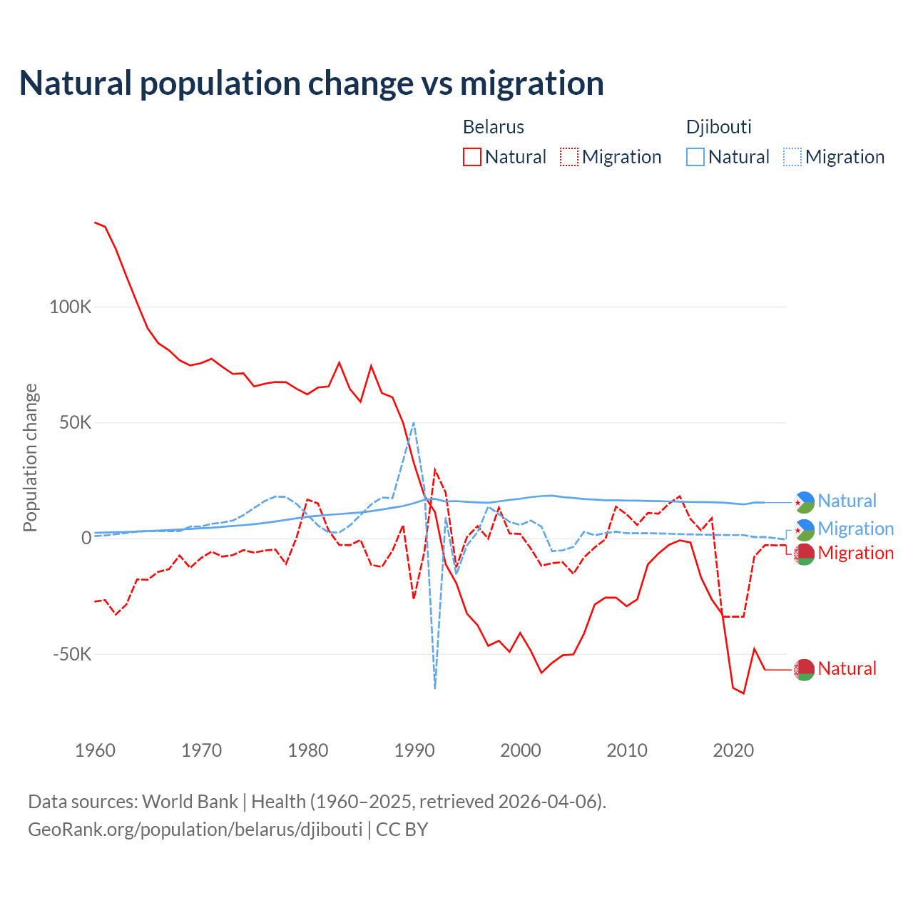Over the last 10 years, 84.2% of the population change in Belarus is from natural causes (a loss of 318,682 people) and 15.8% is from migration (a loss of 59,605 people). In Djibouti 92.1% is from natural causes (a gain of 153,892 people) and 7.87% is from migration (a gain of 13,138 people).