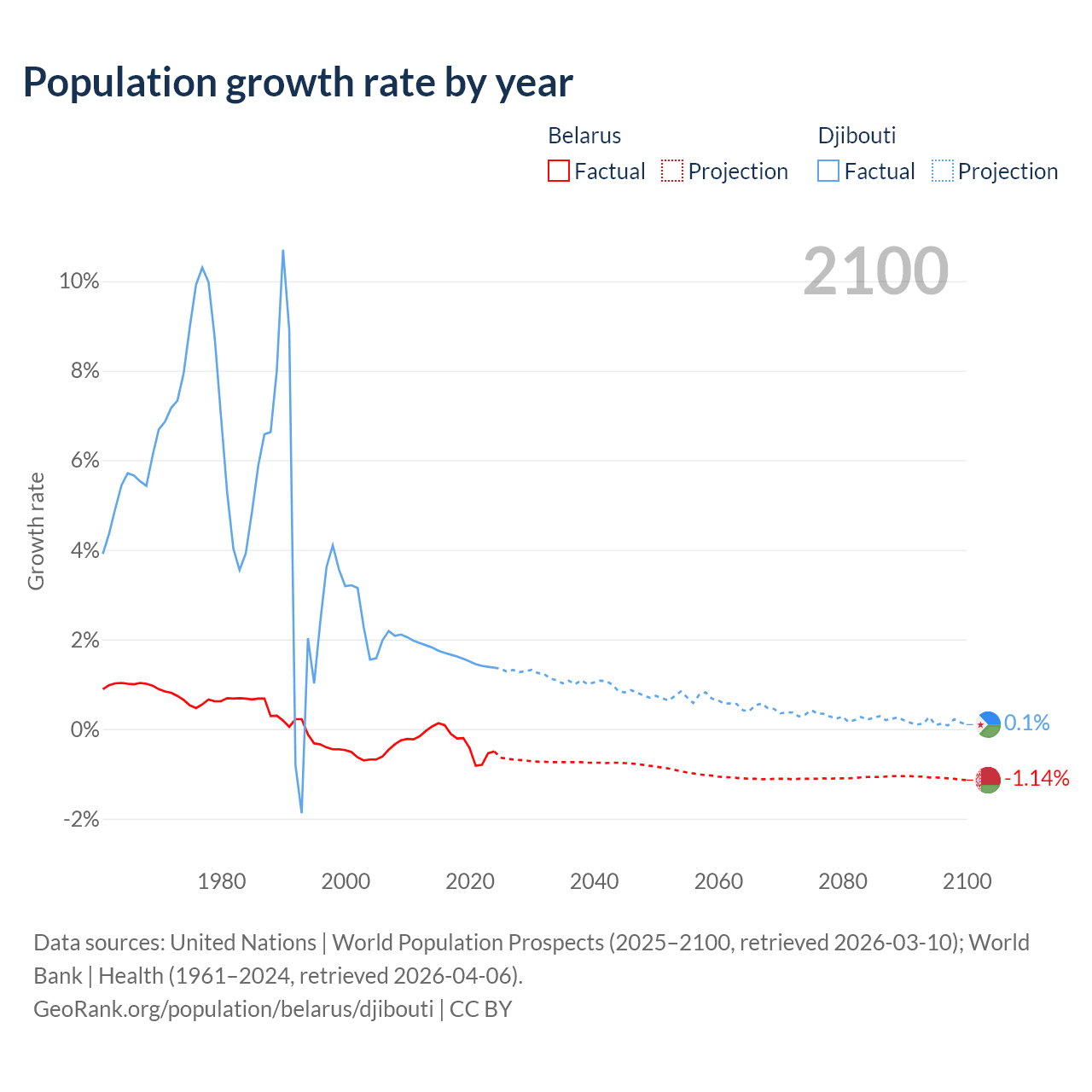 - For the last 10 years, Belarus has had an average growth rate of -0.3% per year vs +1.57% in Djibouti.