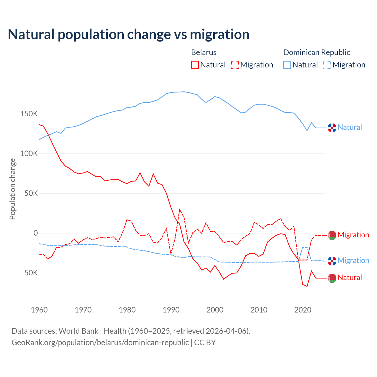 Over the last 10 years, 84.2% of the population change in Belarus is from natural causes (a loss of 318,682 people) and 15.8% is from migration (a loss of 59,605 people). In the Dominican Republic 81.8% is from natural causes (a gain of 1,447,764 people) and 18.2% is from migration (a loss of 322,919 people).
