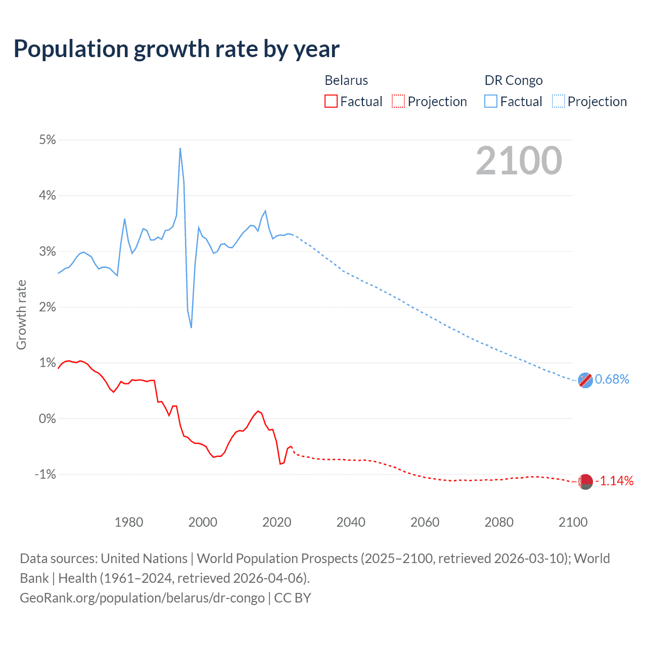 - For the last 10 years, Belarus has had an average growth rate of -0.3% per year vs +3.38% in the DR Congo.
