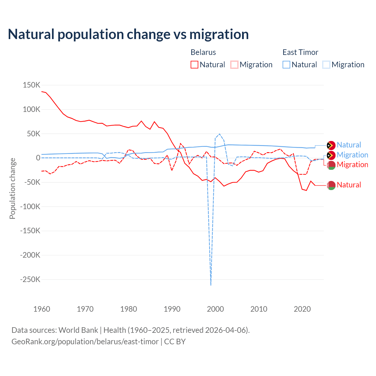 Over the last 10 years, 84.2% of the population change in Belarus is from natural causes (a loss of 318,682 people) and 15.8% is from migration (a loss of 59,605 people). In East Timor 98.3% is from natural causes (a gain of 217,698 people) and 1.66% is from migration (a gain of 3,665 people).
