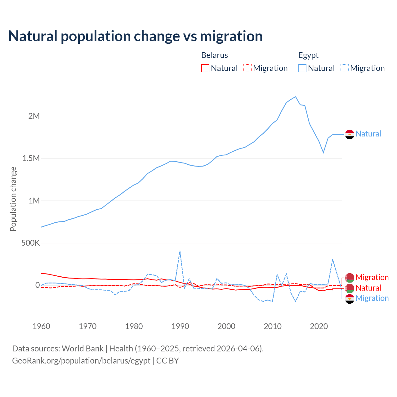 Over the last 10 years, 84.2% of the population change in Belarus is from natural causes (a loss of 318,682 people) and 15.8% is from migration (a loss of 59,605 people). In Egypt 99.6% is from natural causes (a gain of 19,180,073 people) and 0.41% is from migration (a loss of 78,975 people).