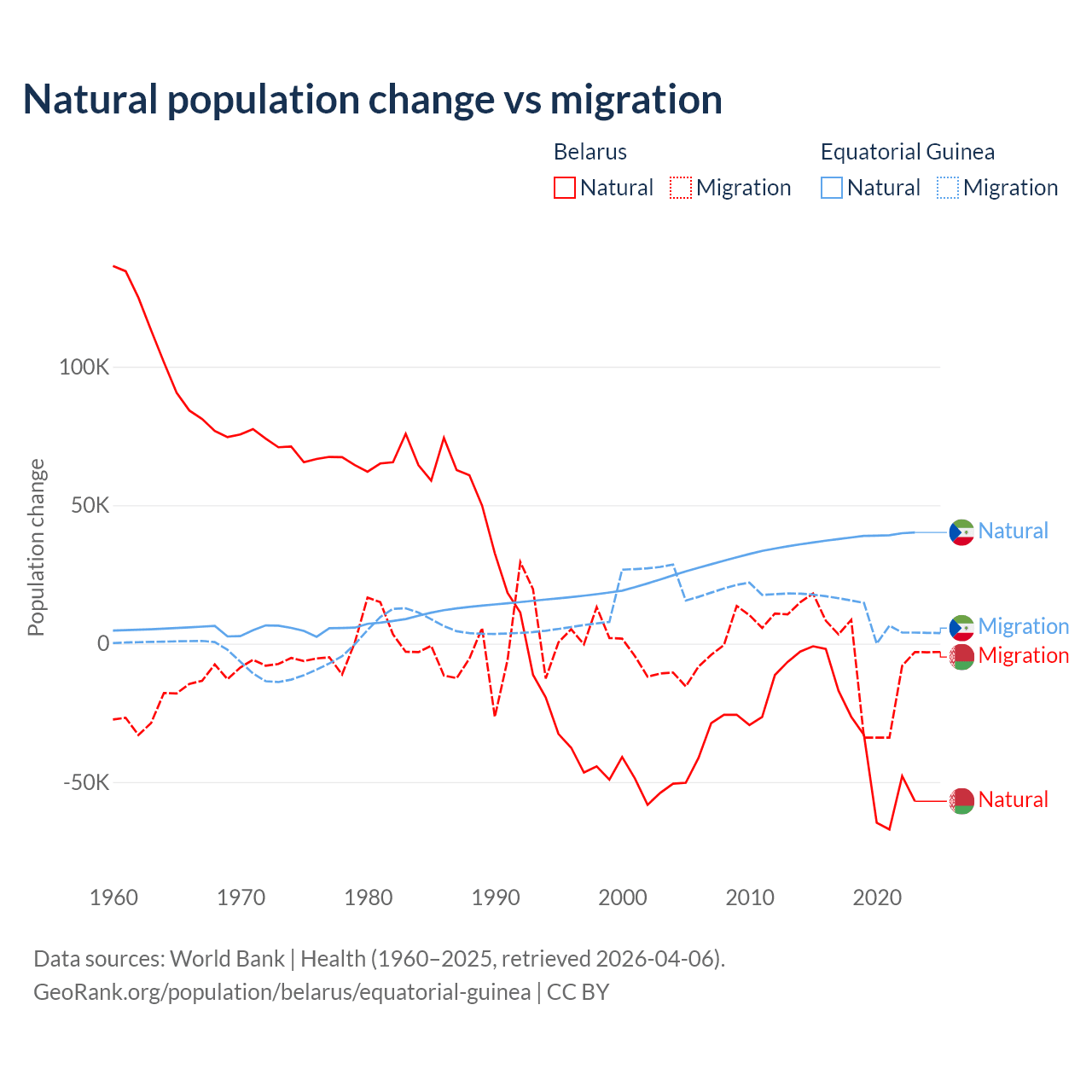 Over the last 10 years, 84.2% of the population change in Belarus is from natural causes (a loss of 318,682 people) and 15.8% is from migration (a loss of 59,605 people). In Equatorial Guinea 77% is from natural causes (a gain of 382,745 people) and 23% is from migration (a gain of 114,024 people).