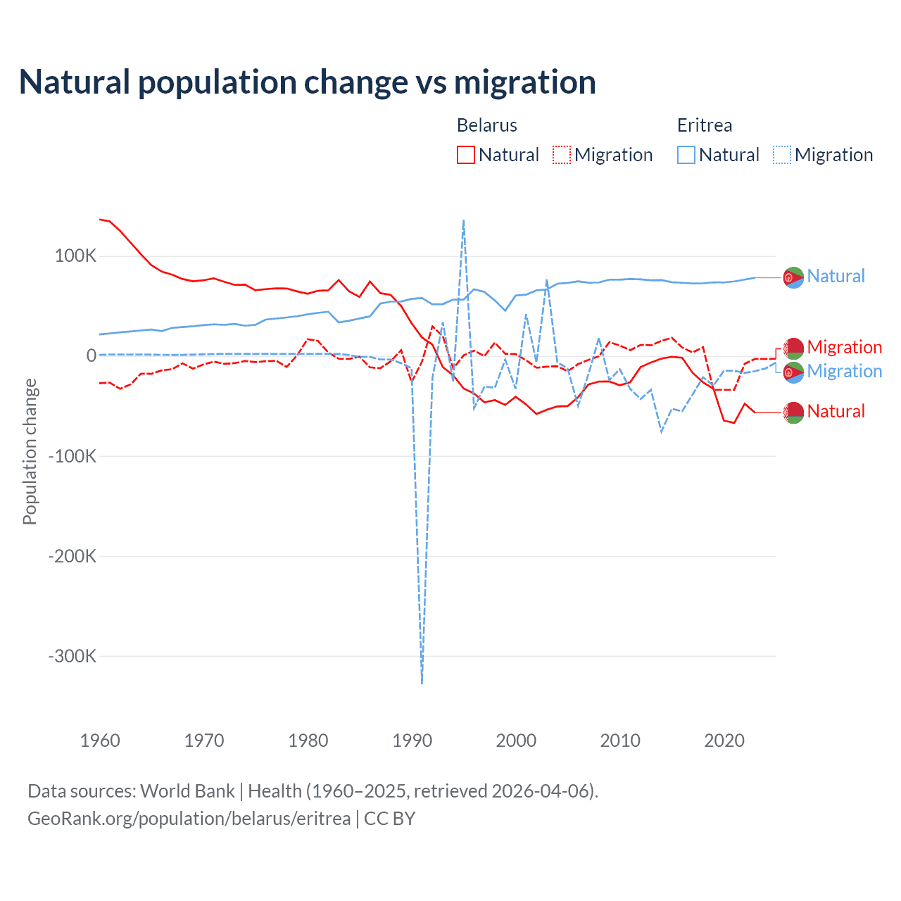 Over the last 10 years, 84.2% of the population change in Belarus is from natural causes (a loss of 318,682 people) and 15.8% is from migration (a loss of 59,605 people). In Eritrea 68.8% is from natural causes (a gain of 742,837 people) and 31.2% is from migration (a loss of 336,243 people).