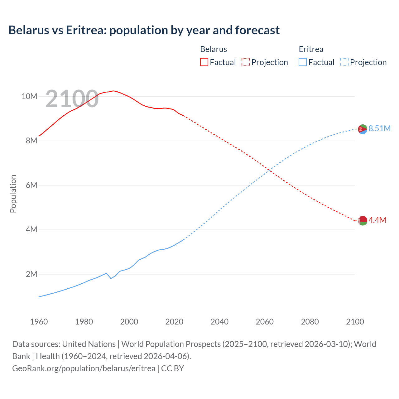 The latest officially reported population of Belarus was 9,132,629 in 2024 vs 3,535,603 people in Eritrea in 2024. In 2026, based on the adjusted UN estimation, the current Belarus' population is 9,013,835 people compared to 3,700,586 in Eritrea.