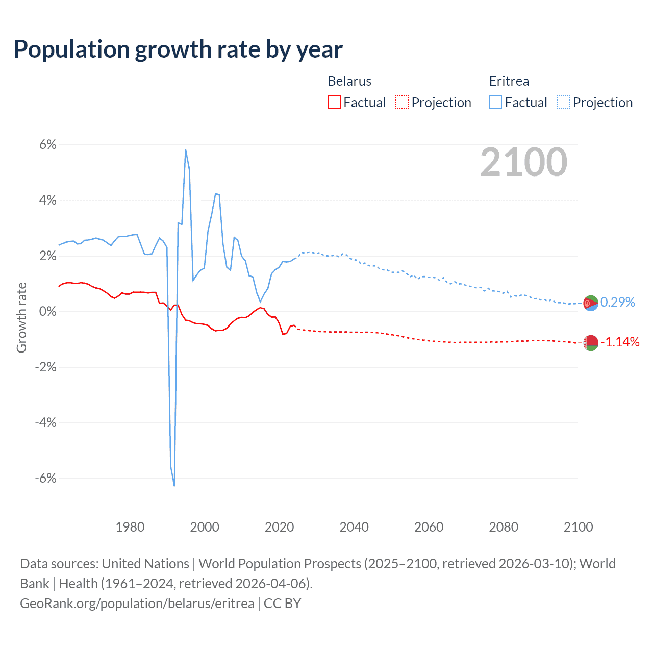 - For the last 10 years, Belarus has had an average growth rate of -0.3% per year vs +1.28% in Eritrea.