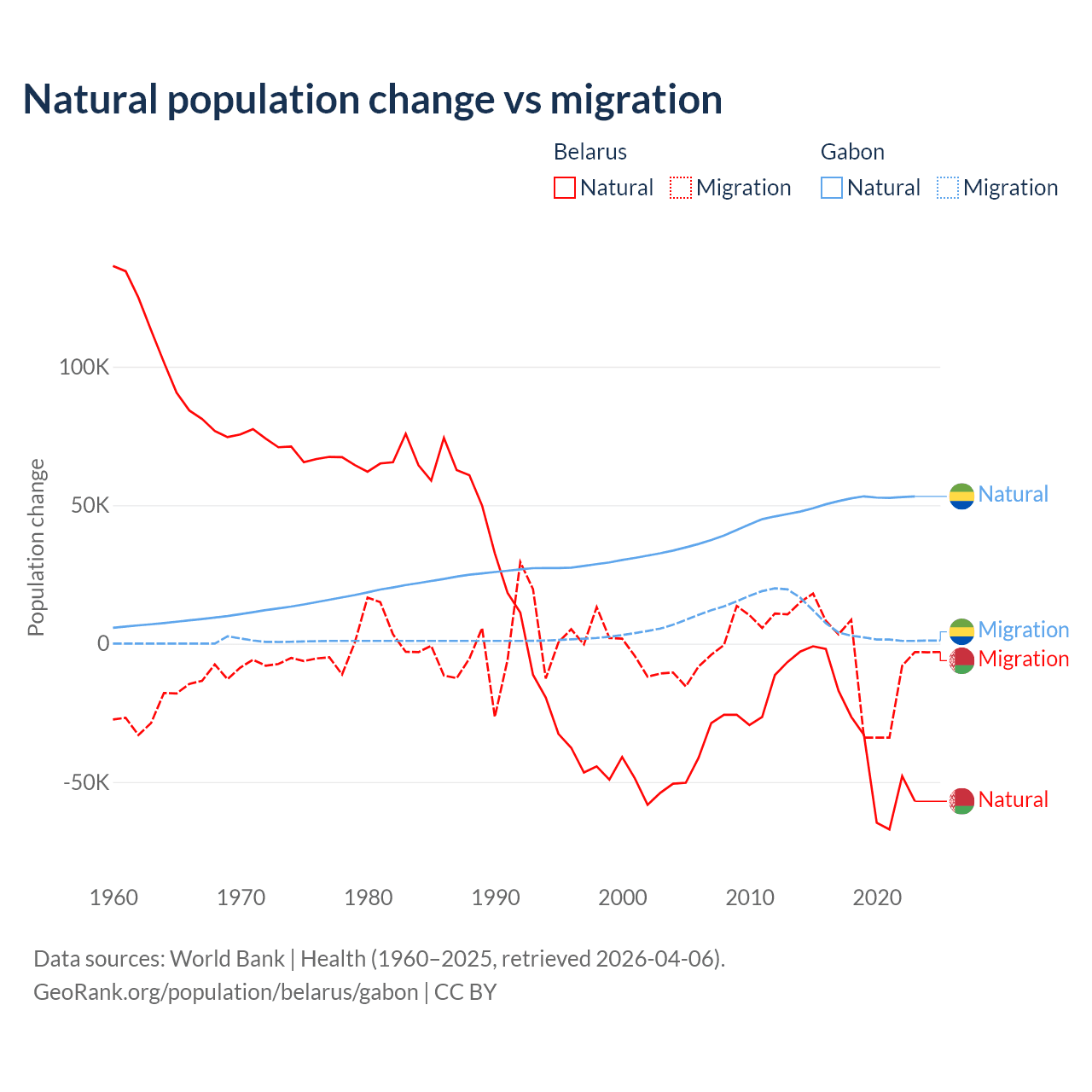 Over the last 10 years, 84.2% of the population change in Belarus is from natural causes (a loss of 318,682 people) and 15.8% is from migration (a loss of 59,605 people). In Gabon 91.1% is from natural causes (a gain of 515,484 people) and 8.86% is from migration (a gain of 50,119 people).