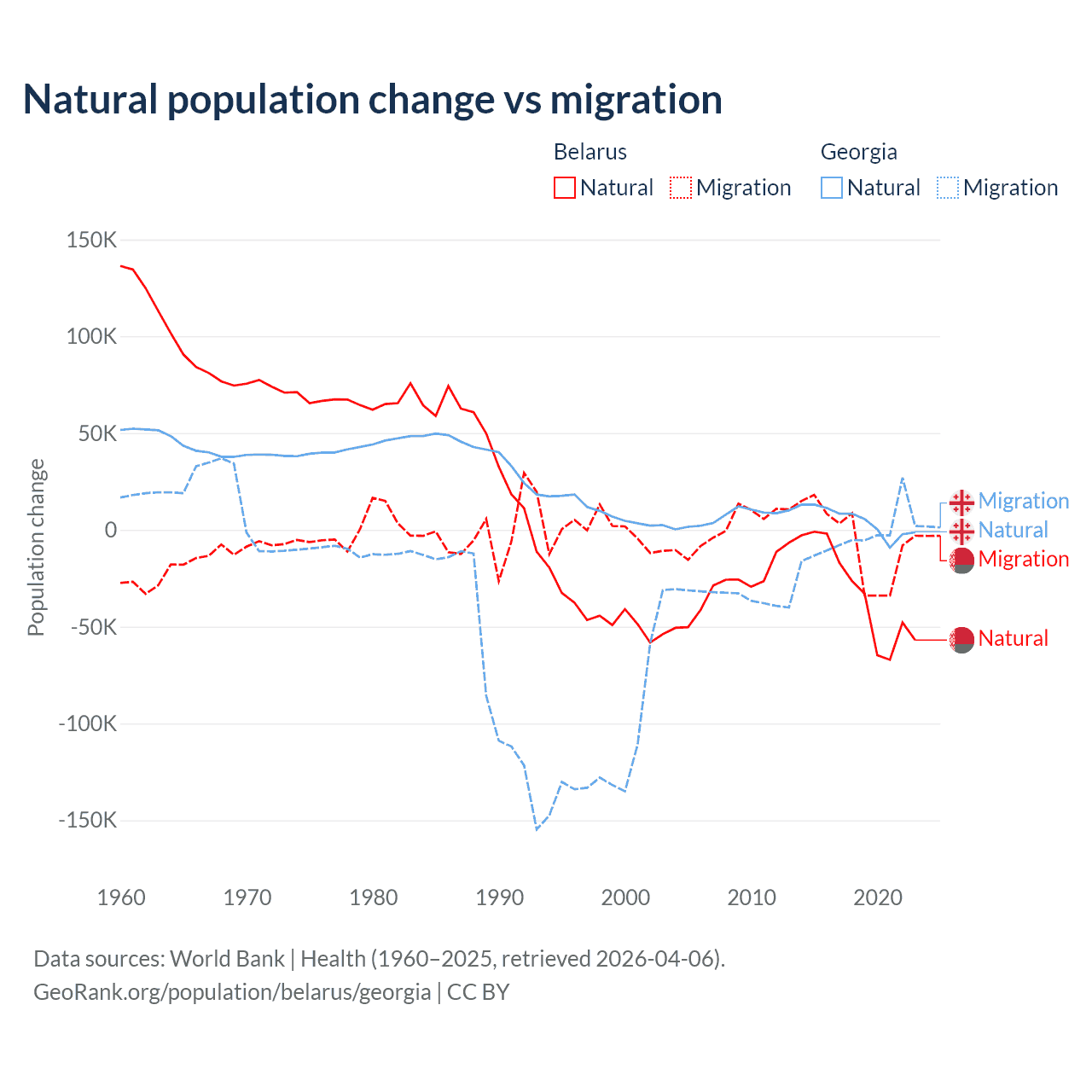 Over the last 10 years, 84.2% of the population change in Belarus is from natural causes (a loss of 318,682 people) and 15.8% is from migration (a loss of 59,605 people). In Georgia 57.7% is from natural causes (a gain of 47,646 people) and 42.3% is from migration (a loss of 34,907 people).