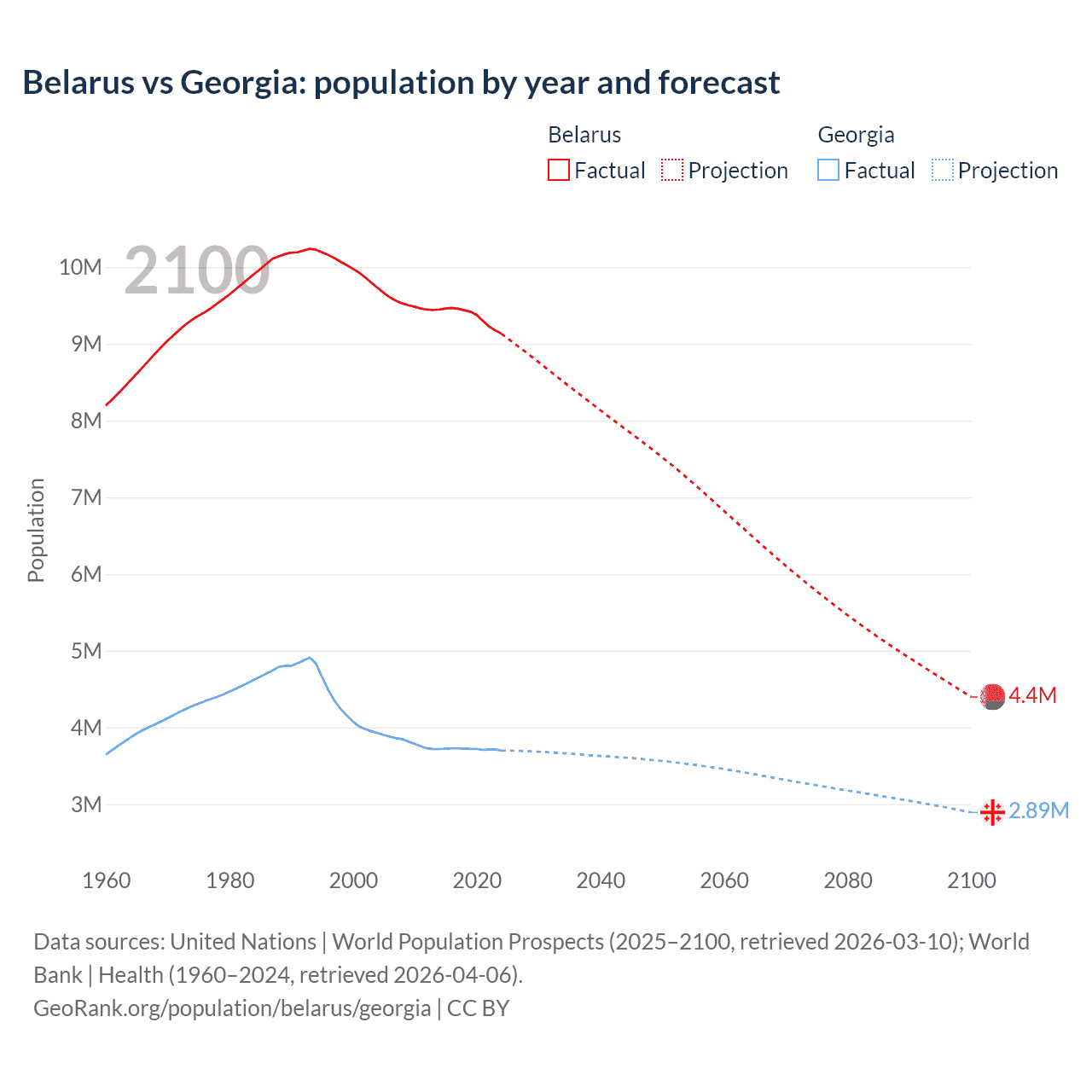 The latest officially reported population of Belarus was 9,132,629 in 2024 vs 3,699,557 people in Georgia in 2024. In 2026, based on the adjusted UN estimation, the current Belarus' population is 9,013,835 people compared to 3,697,615 in Georgia.