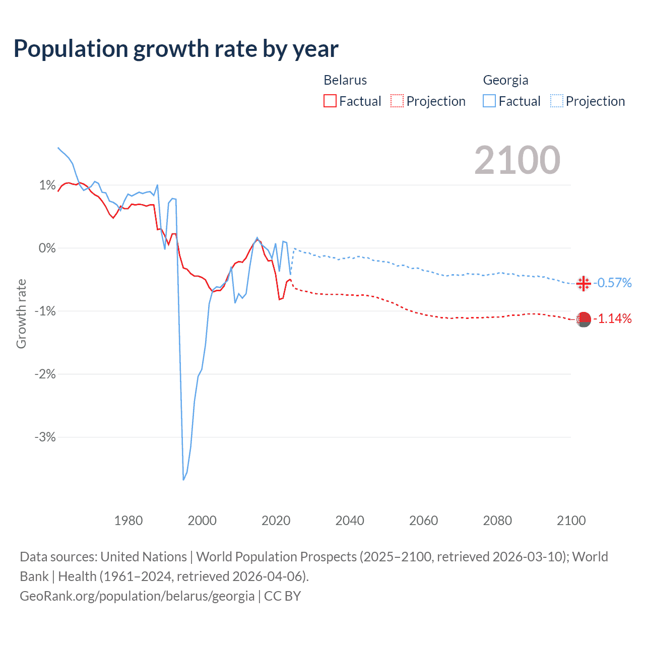 - For the last 10 years, Belarus has had an average growth rate of -0.3% per year vs -0.04% in Georgia.