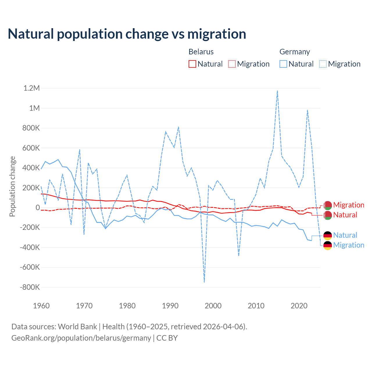 Over the last 10 years, 84.2% of the population change in Belarus is from natural causes (a loss of 318,682 people) and 15.8% is from migration (a loss of 59,605 people). In Germany 26.8% is from natural causes (a loss of 2,036,130 people) and 73.2% is from migration (a gain of 5,565,916 people).