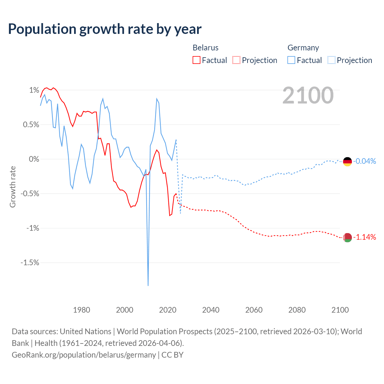 - For the last 10 years, Belarus has had an average growth rate of -0.3% per year vs +0.32% in Germany.
