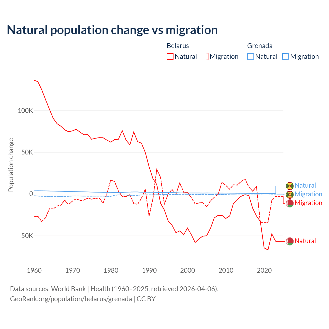 Over the last 10 years, 84.2% of the population change in Belarus is from natural causes (a loss of 318,682 people) and 15.8% is from migration (a loss of 59,605 people). In Grenada 76% is from natural causes (a gain of 4,850 people) and 24% is from migration (a loss of 1,535 people).