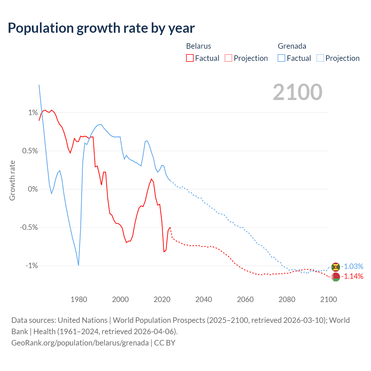 - For the last 10 years, Belarus has had an average growth rate of -0.3% per year vs +0.29% in Grenada.