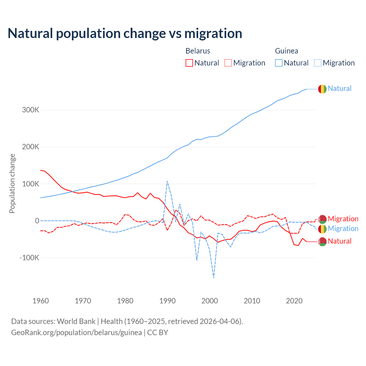 Over the last 10 years, 84.2% of the population change in Belarus is from natural causes (a loss of 318,682 people) and 15.8% is from migration (a loss of 59,605 people). In Guinea 97.2% is from natural causes (a gain of 3,346,936 people) and 2.76% is from migration (a loss of 94,924 people).