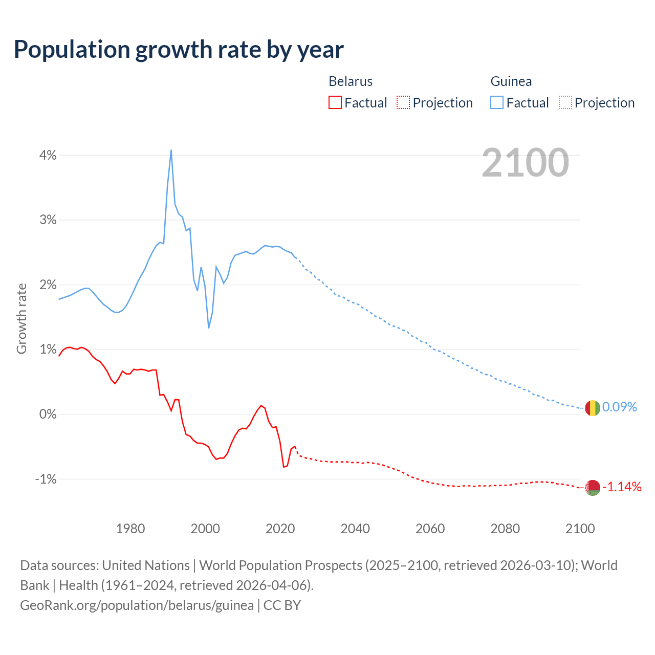 - For the last 10 years, Belarus has had an average growth rate of -0.3% per year vs +2.54% in Guinea.