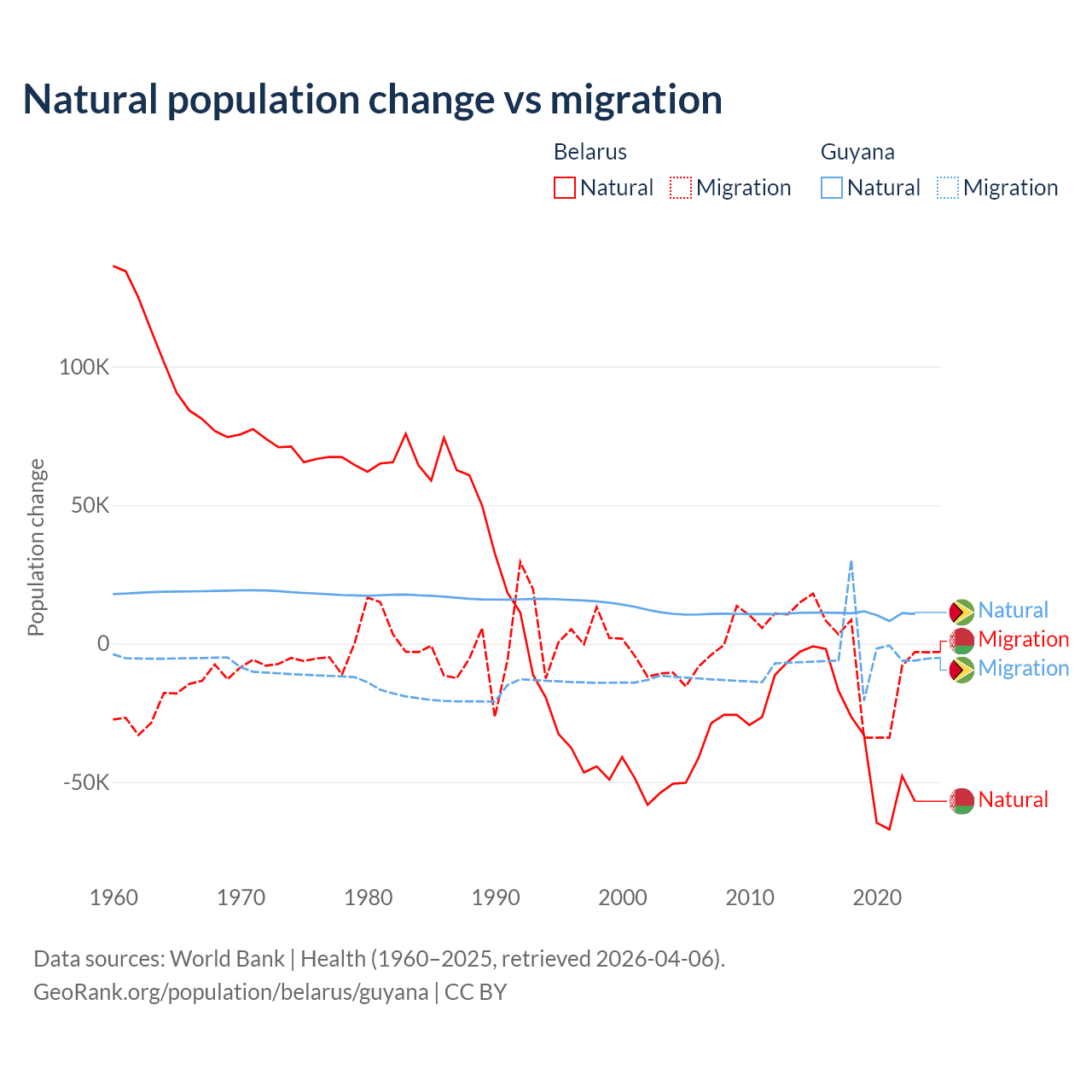 Over the last 10 years, 84.2% of the population change in Belarus is from natural causes (a loss of 318,682 people) and 15.8% is from migration (a loss of 59,605 people). In Guyana 77.7% is from natural causes (a gain of 107,419 people) and 22.3% is from migration (a loss of 30,797 people).