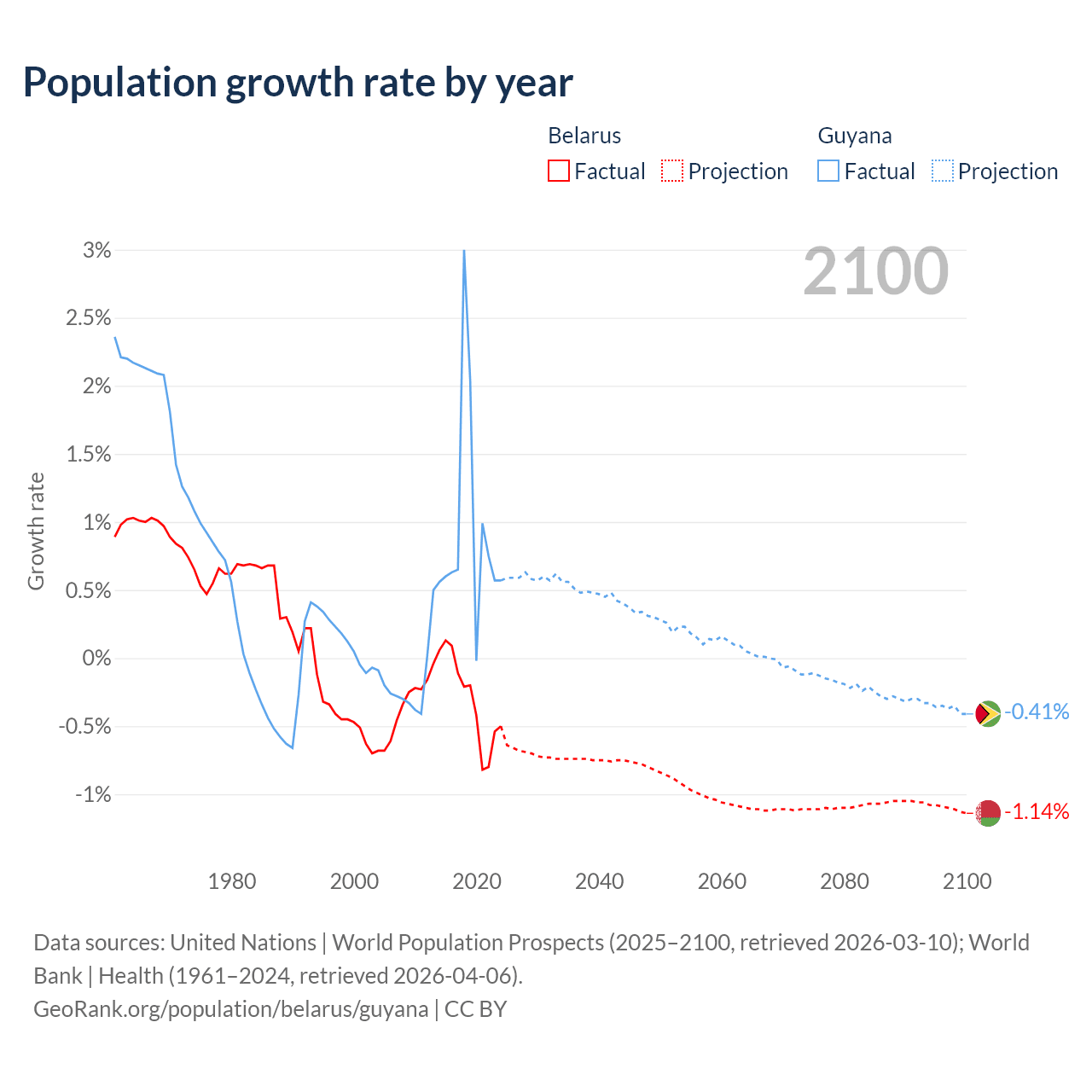 - For the last 10 years, Belarus has had an average growth rate of -0.3% per year vs +0.94% in Guyana.
