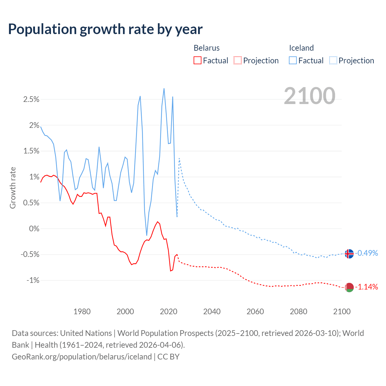 - For the last 10 years, Belarus has had an average growth rate of -0.3% per year vs +1.63% in Iceland.