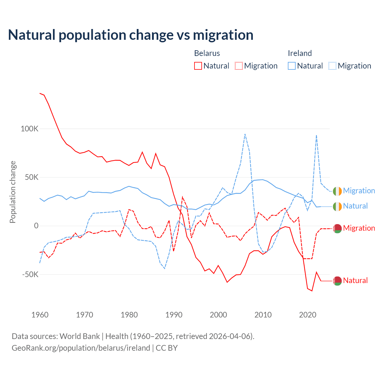 Over the last 10 years, 84.2% of the population change in Belarus is from natural causes (a loss of 318,682 people) and 15.8% is from migration (a loss of 59,605 people). In Ireland 48.2% is from natural causes (a gain of 284,644 people) and 51.8% is from migration (a gain of 305,297 people).