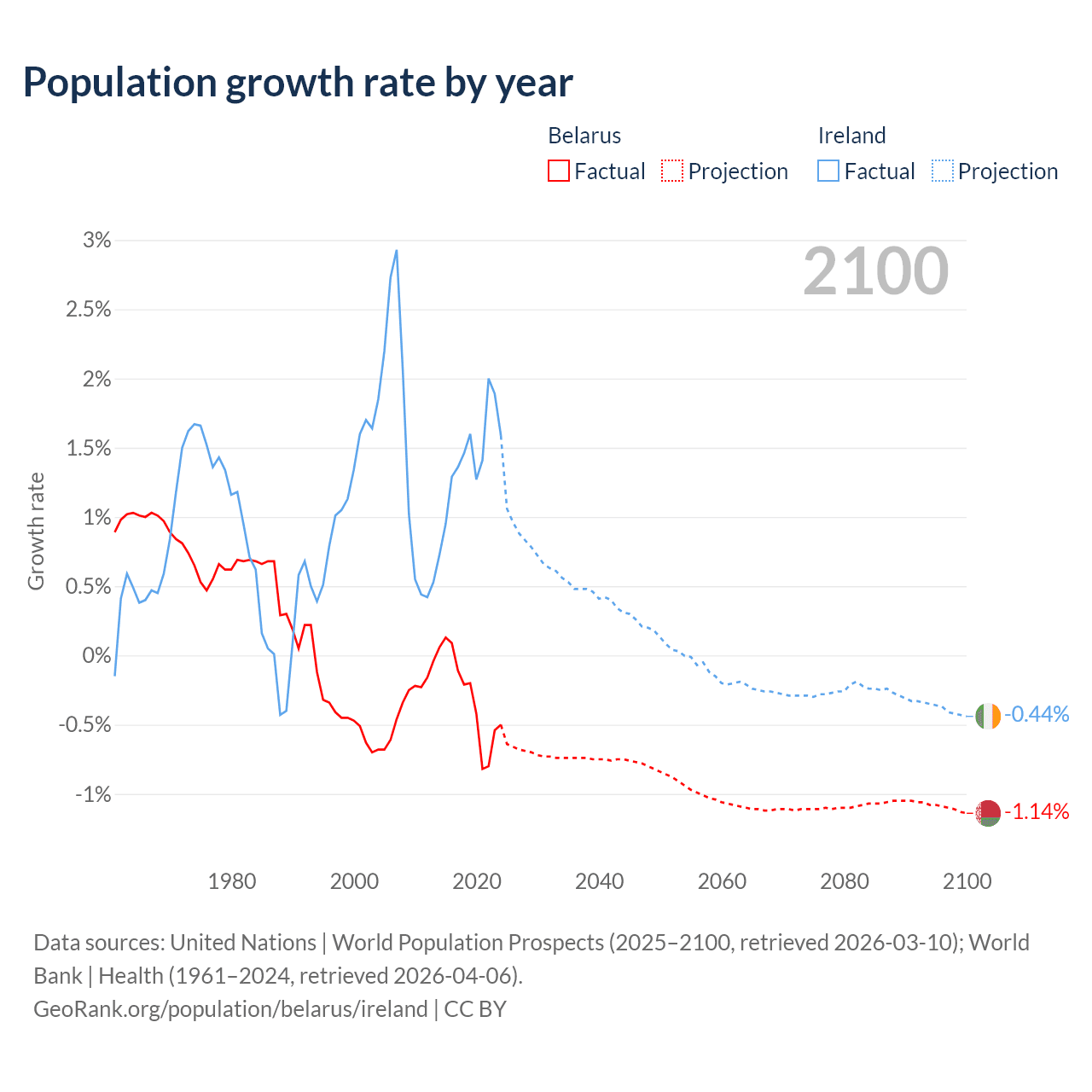 - For the last 10 years, Belarus has had an average growth rate of -0.3% per year vs +1.41% in Ireland.