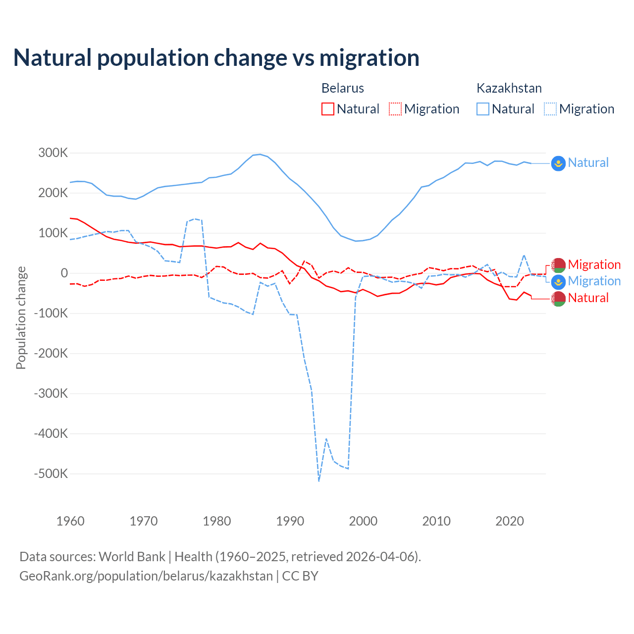 Over the last 10 years, 84.2% of the population change in Belarus is from natural causes (a loss of 318,682 people) and 15.8% is from migration (a loss of 59,605 people). In Kazakhstan 98.7% is from natural causes (a gain of 2,743,094 people) and 1.33% is from migration (a gain of 36,908 people).