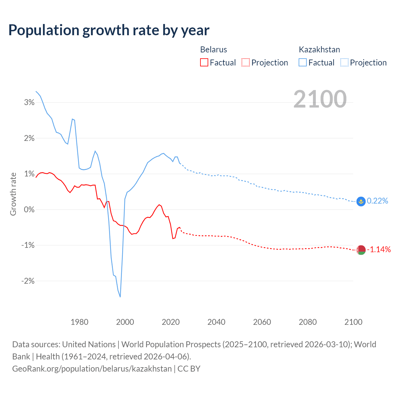 - Since 2006, the population of Belarus has decreased from 9.6M people to 9.01M (6.15% decline), while Kazakhstan has grown from 16.1M to 21.2M (31.4% growth).