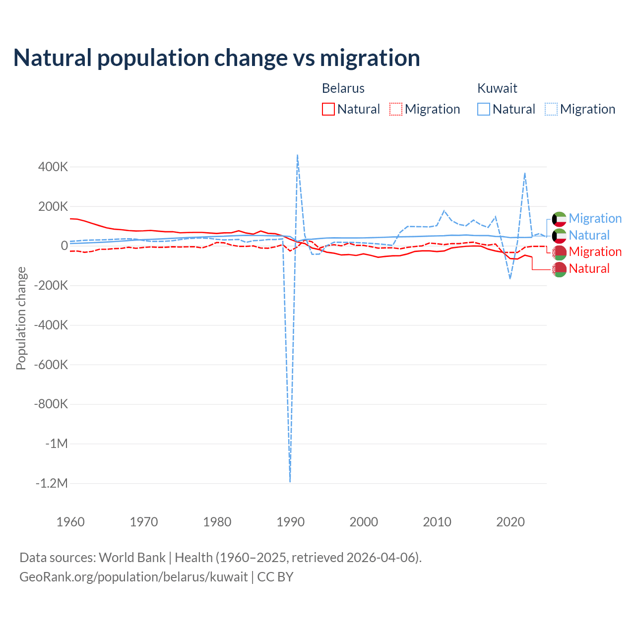 Over the last 10 years, 84.2% of the population change in Belarus is from natural causes (a loss of 318,682 people) and 15.8% is from migration (a loss of 59,605 people). In Kuwait 35.8% is from natural causes (a gain of 470,645 people) and 64.2% is from migration (a gain of 845,142 people).