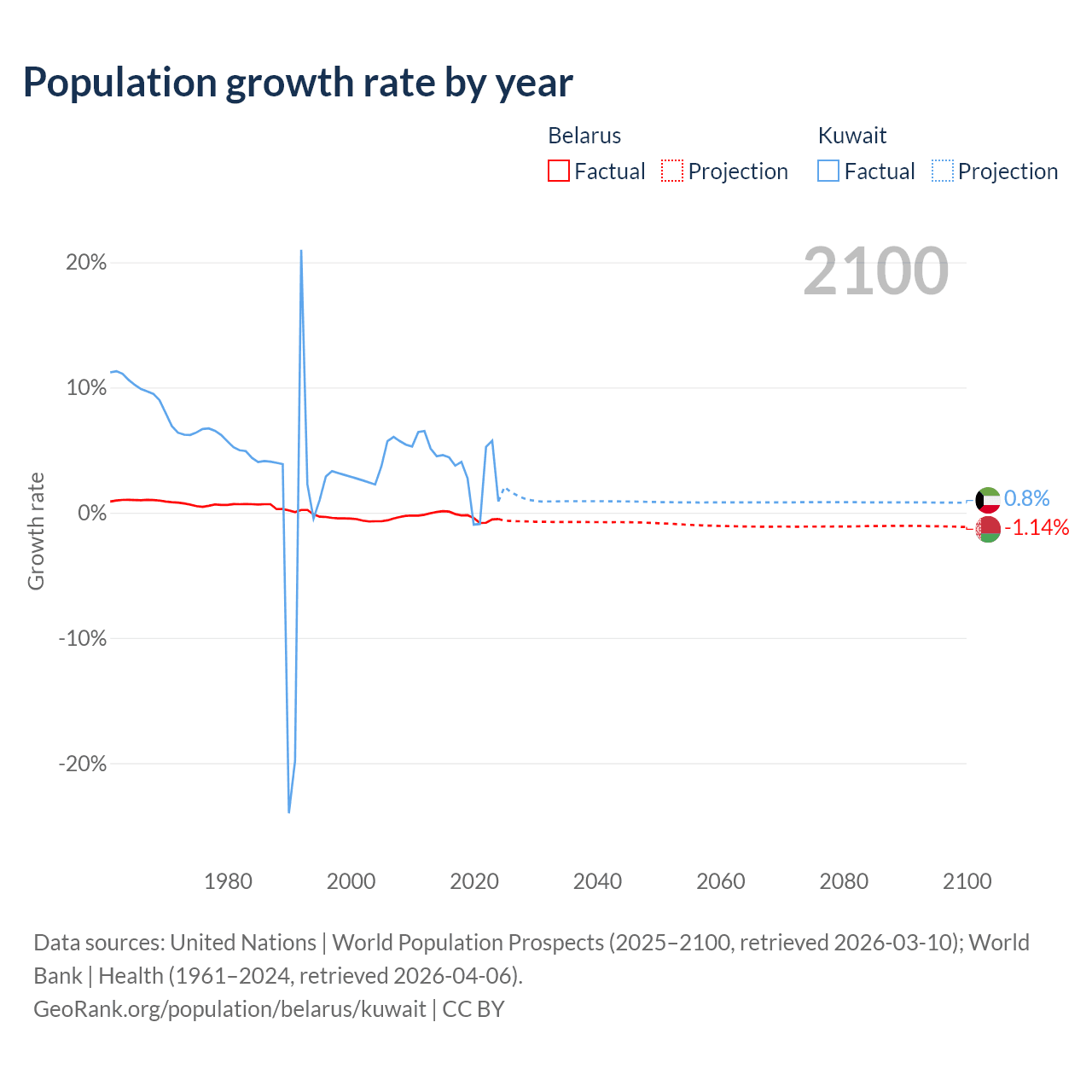 - For the last 10 years, Belarus has had an average growth rate of -0.3% per year vs +3.1% in Kuwait.