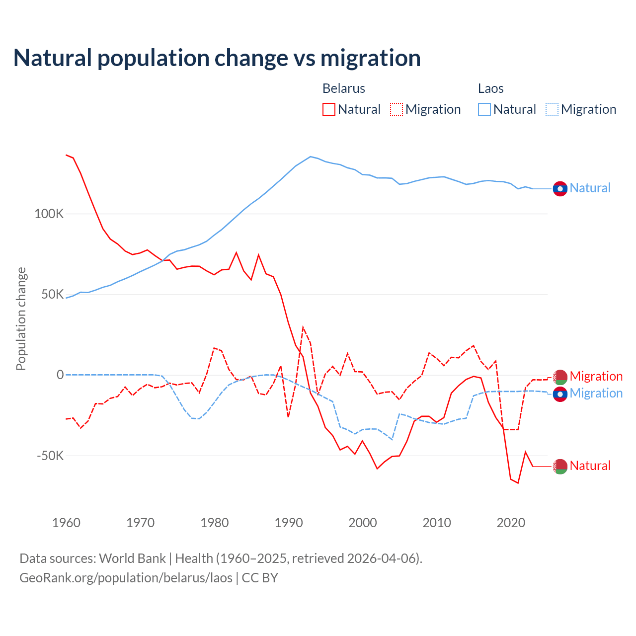 Over the last 10 years, 84.2% of the population change in Belarus is from natural causes (a loss of 318,682 people) and 15.8% is from migration (a loss of 59,605 people). In Laos 90.6% is from natural causes (a gain of 1,183,013 people) and 9.41% is from migration (a loss of 122,899 people).