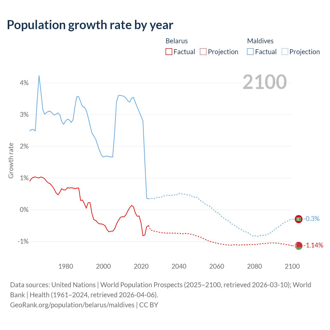 - For the last 10 years, Belarus has had an average growth rate of -0.3% per year vs +2.56% in Maldives.