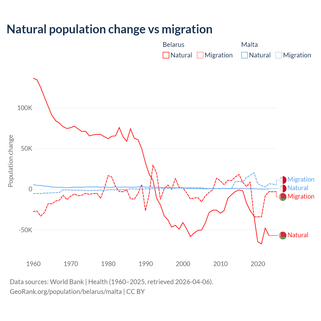 Over the last 10 years, 84.2% of the population change in Belarus is from natural causes (a loss of 318,682 people) and 15.8% is from migration (a loss of 59,605 people). In Malta 5.84% is from natural causes (a gain of 6,181 people) and 94.2% is from migration (a gain of 99,652 people).