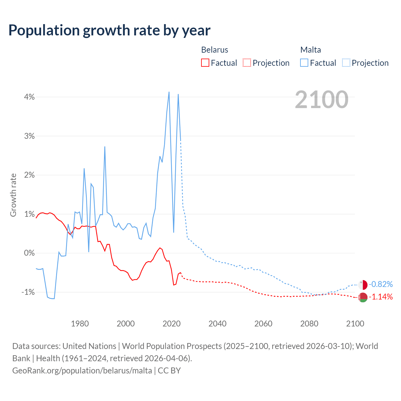 - Since 2006, the population of Belarus has decreased from 9.6M people to 9.01M (6.15% decline), while Malta has grown from 405K to 582K (43.5% growth).