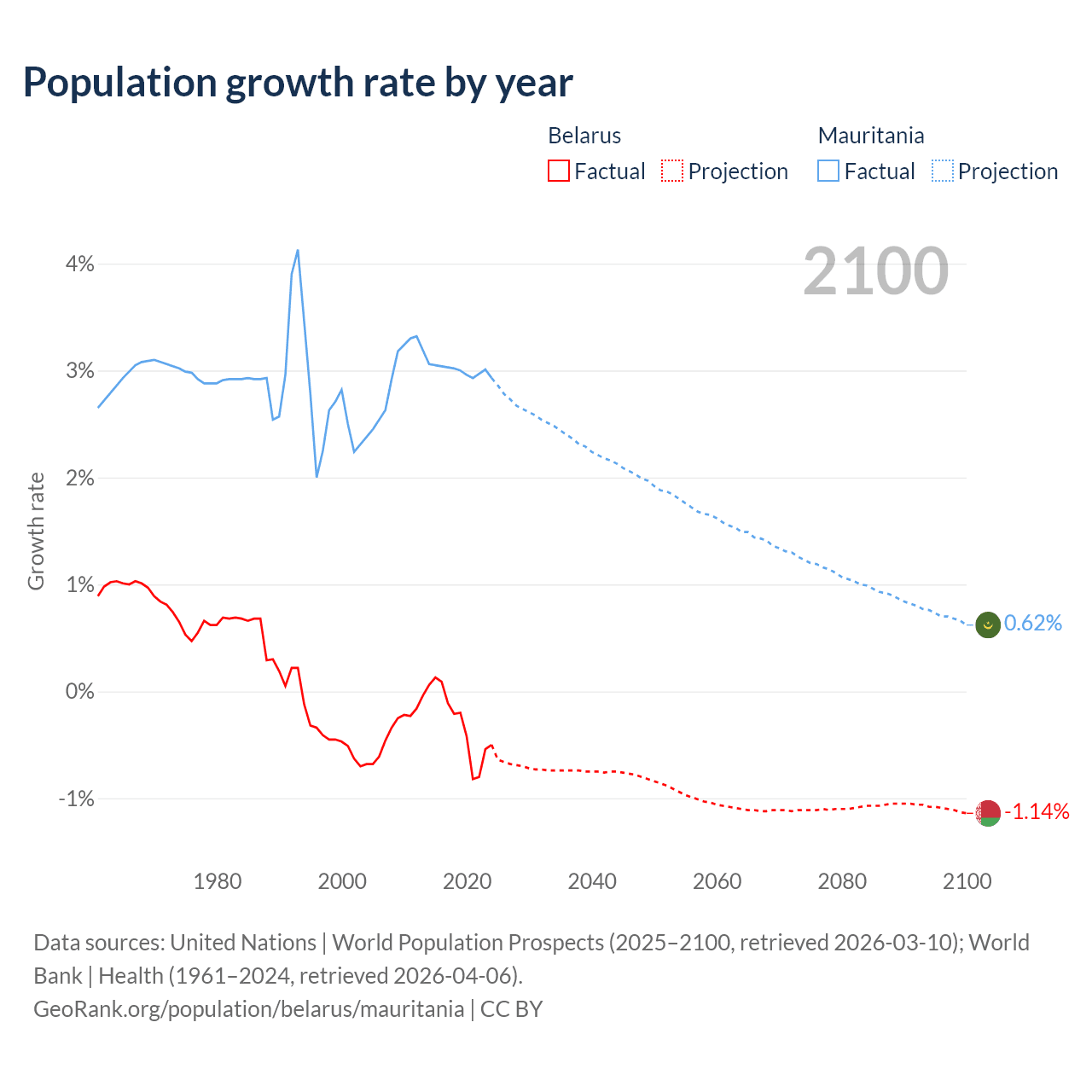- For the last 10 years, Belarus has had an average growth rate of -0.3% per year vs +3% in Mauritania.