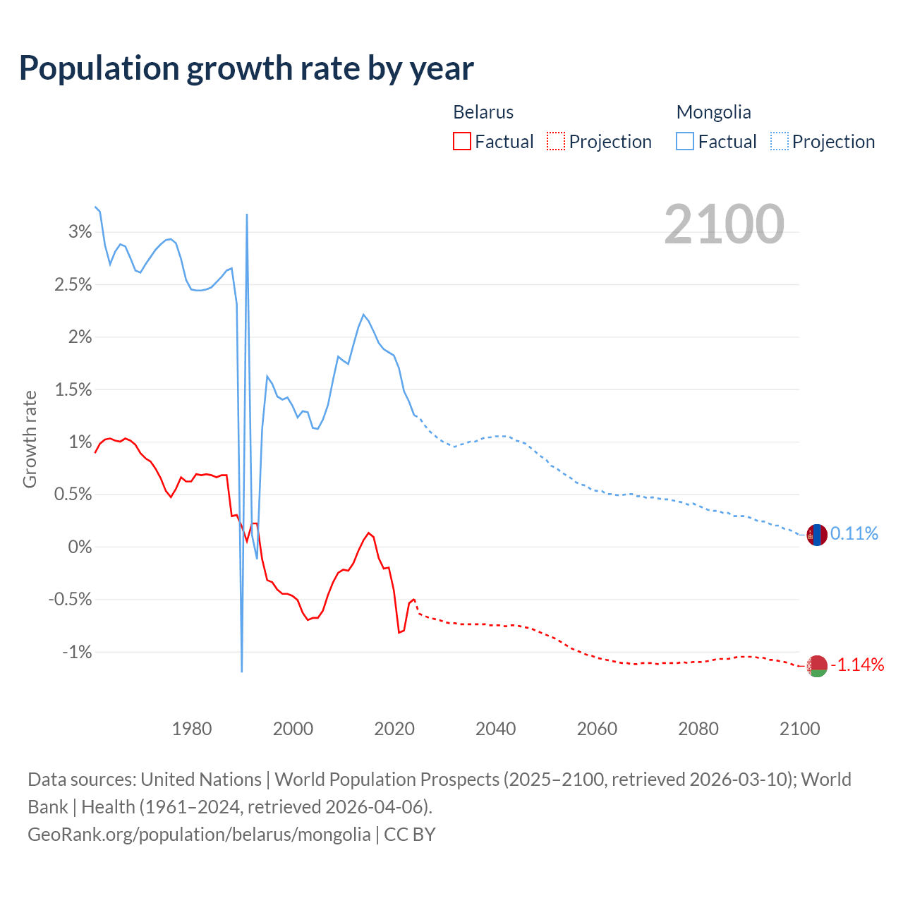 - For the last 10 years, Belarus has had an average growth rate of -0.3% per year vs +1.79% in Mongolia.