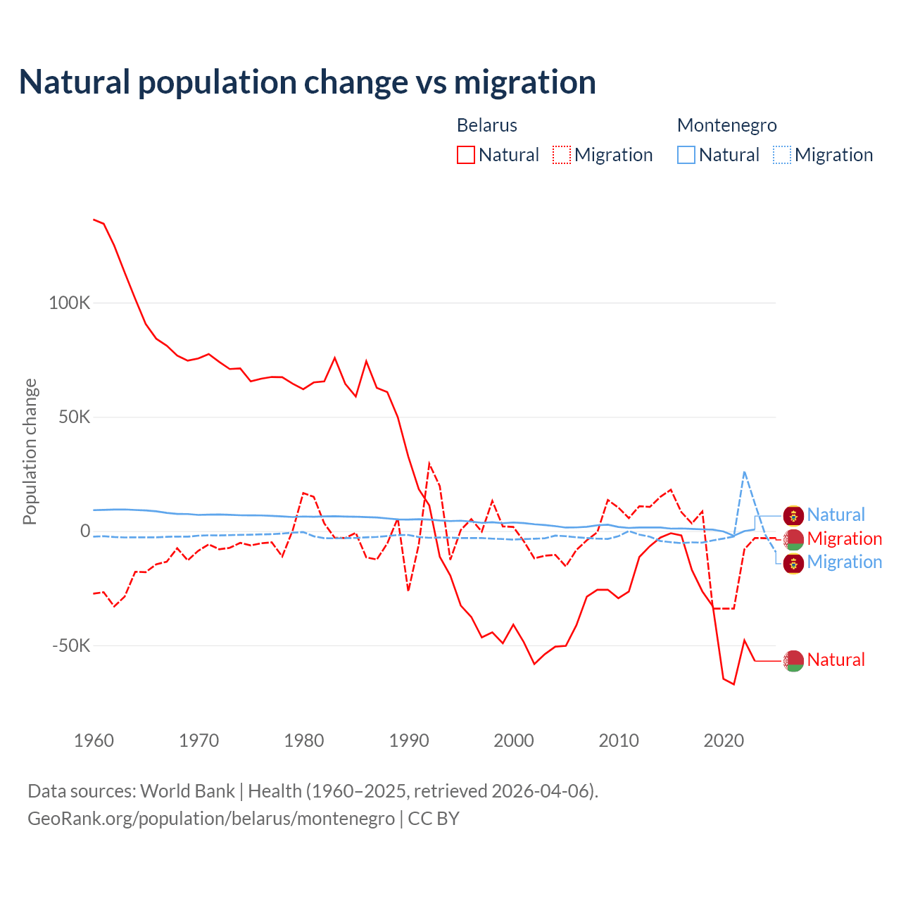 Over the last 10 years, 84.2% of the population change in Belarus is from natural causes (a loss of 318,682 people) and 15.8% is from migration (a loss of 59,605 people). In Montenegro 52.4% is from natural causes (a gain of 4,501 people) and 47.6% is from migration (a gain of 4,095 people).